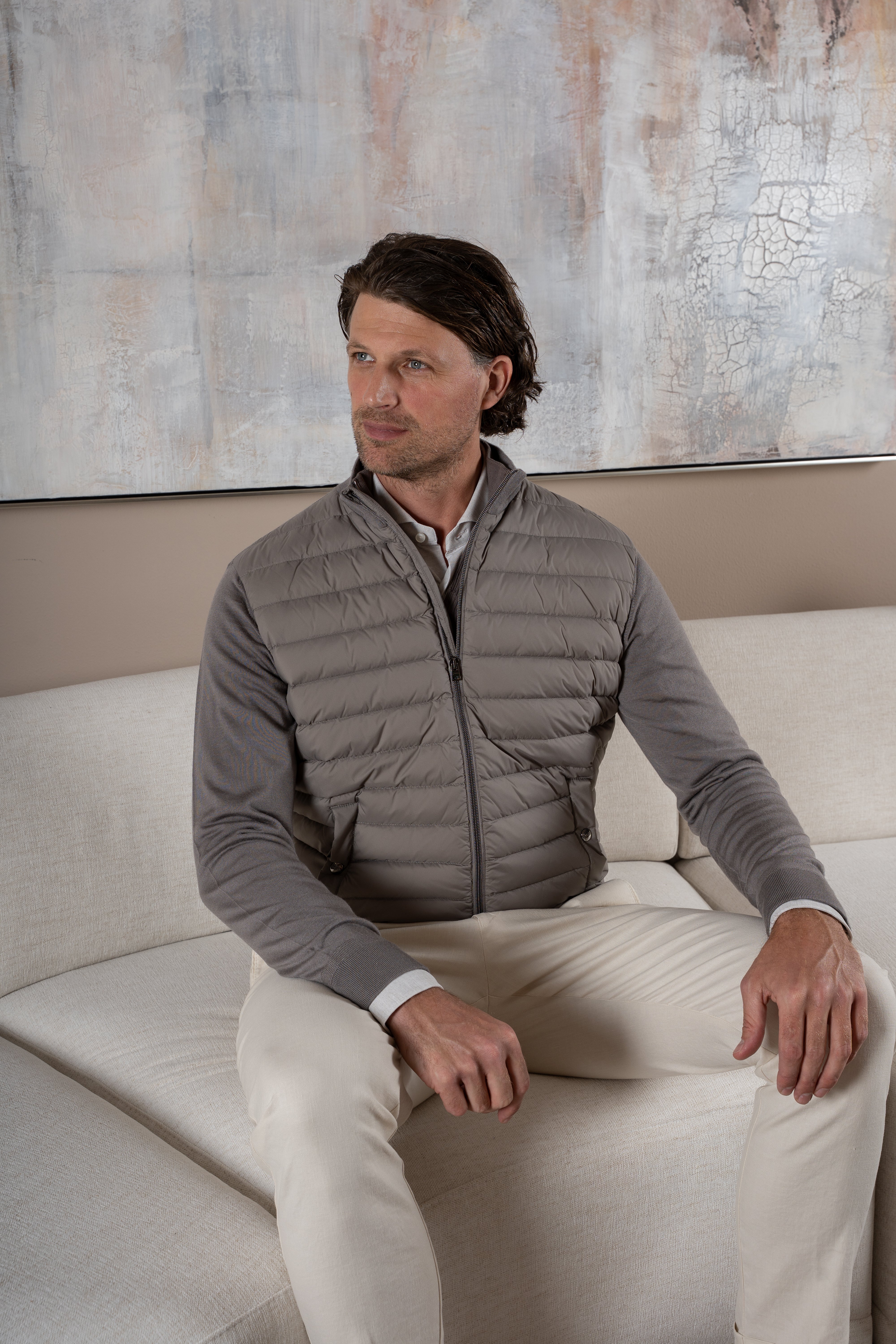 Dankzij de strakke lijnen, subtiele glans en hoogwaardige afwerking is deze bodywarmer een veelzijdig kledingstuk dat perfect past binnen een moderne smart-casual garderobe.