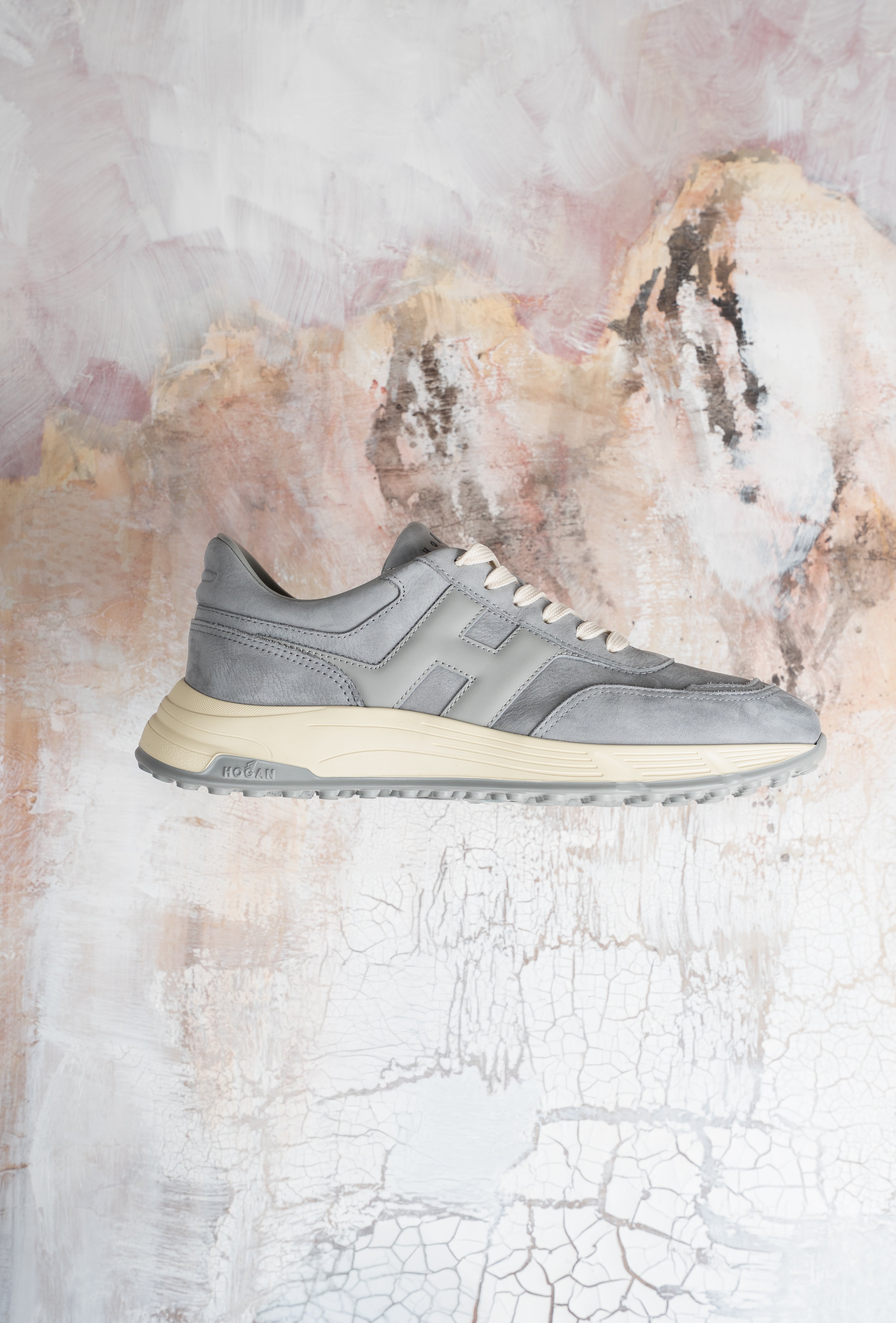 De upper is uitgevoerd in zacht suède, gecombineerd met geweven textielinserts en glad leren details. Het hot-stamped HGN86-logo verwijst subtiel naar het erfgoed van Hogan en geeft de sneaker een herkenbare, premium finishing touch.