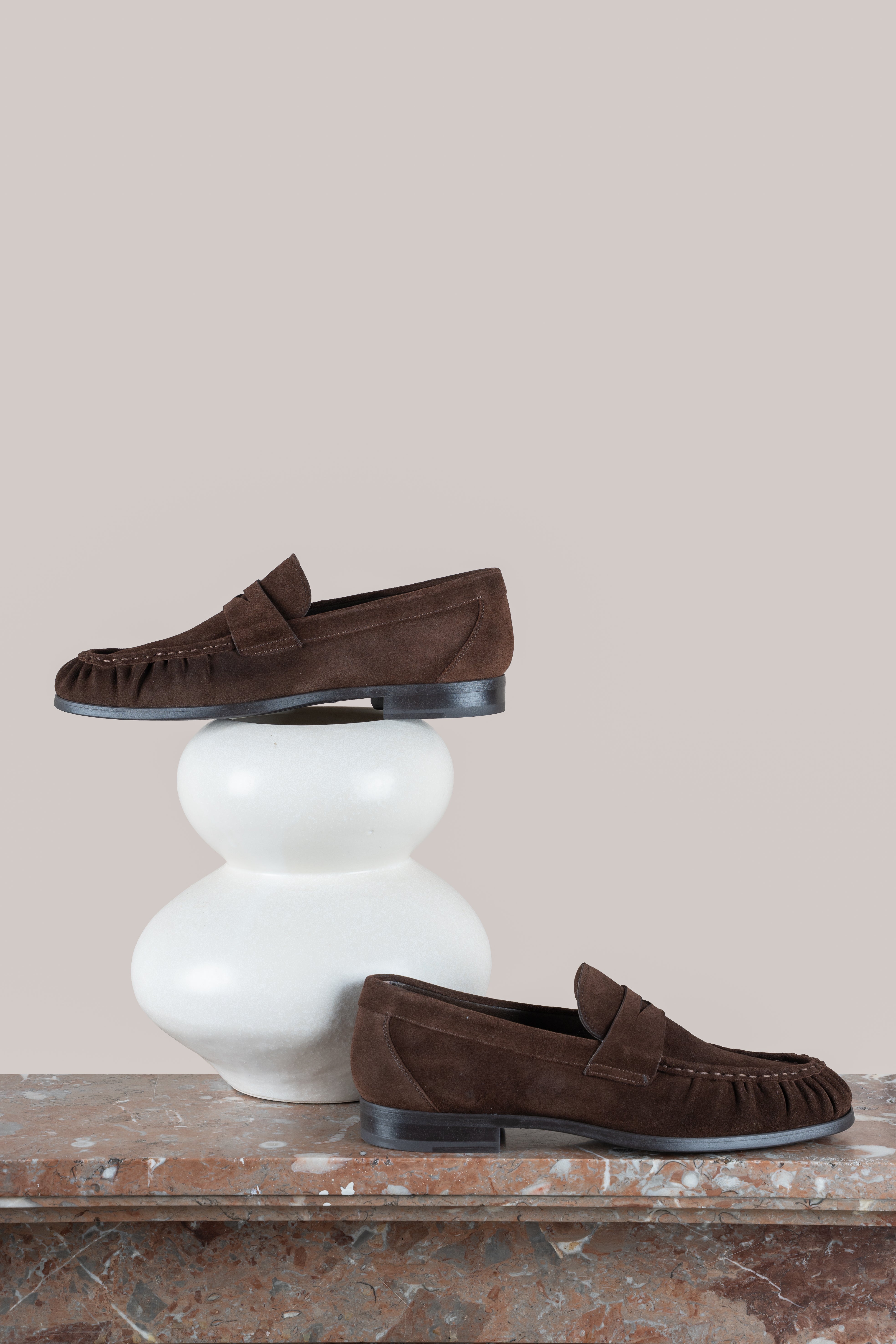 De warme bruine suèdekleur geeft de loafers een elegante en veelzijdige uitstraling, terwijl de ronde neus met subtiele plooidetails zorgt voor een onderscheidend en karaktervol design.